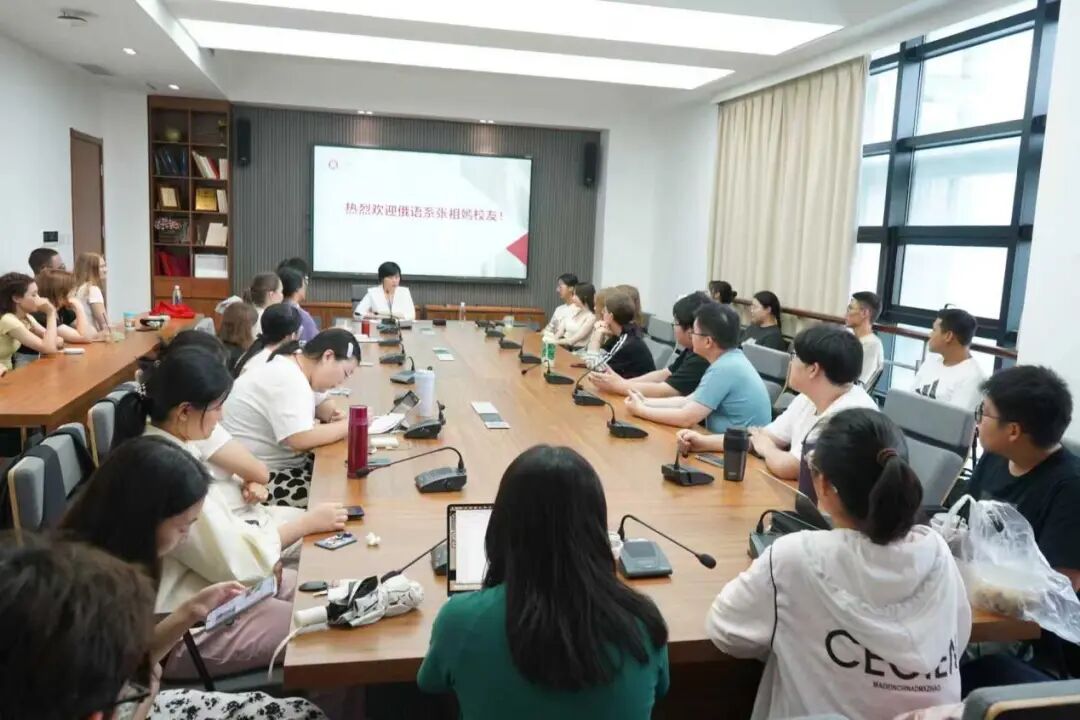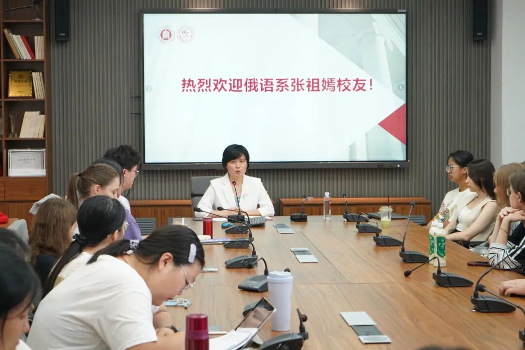 2025年9月24日,黄浦区国际交流主任、俄语系2002届校友张祖嫣返校,与永利3544am登录官网围绕国际化人才培养及校外实践基地建设等事宜开展交流座谈,并为俄语系学生开展“基层涉外交流工作的实践与感悟”主题分享。永利3544am登录官网党委书记韩春红、党委副书记兼副院长武娟、俄语系主任胡学星、俄语系青年班主任班婕、永利3544am登录官网校友基金工作联络人侯嫣茹、俄语系辅导员冯烨参加座谈;俄语系本硕博学生40余人参加交流分享活动。